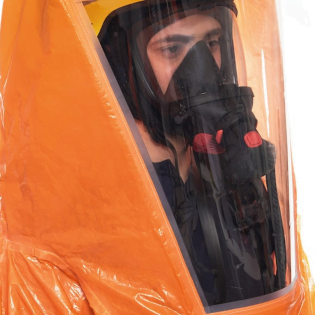 ชุดป้องกันการกระเด็น SPC 4900 มีหมวกคลุมใหญ่พิเศษพร้อมกระ บังหน้า ชุดนี้ใช้กับหน้ากากเต็มหน้าที่ใช้ร่วมกับ SCBA